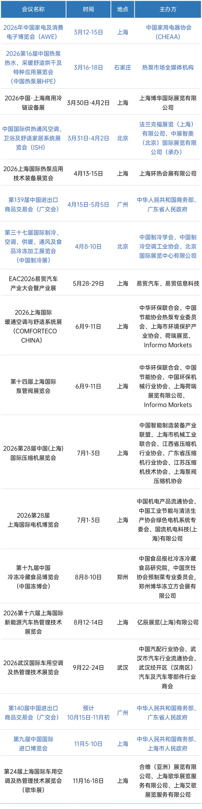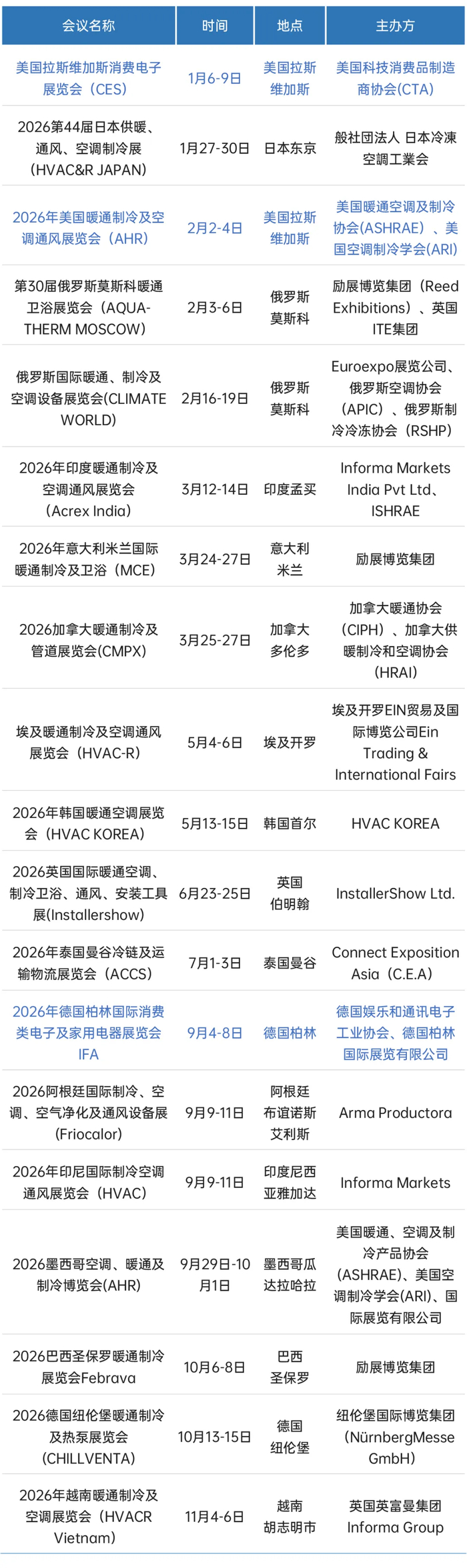 近年来,越来越多的行业展会走入大家的视野。在2026年的脚步临近之际,我们汇总了一份国内外主要展会排期,看看新的一年里,暖通及家电行业有哪些不容错过的重要展会。