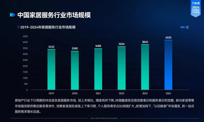 根据《2024家居服务行业洞察报告》,2024年家居服务市场规模已达4025亿元。其中,根据贝哲斯咨询数据,2024年中国家电维修服务市场规模达到250.33亿元。