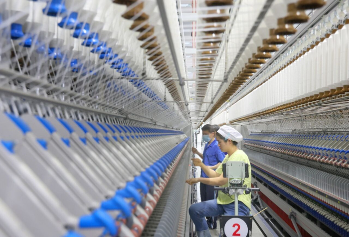 纺织工人在江苏大生集团碳中和智慧纺纱工厂生产车间忙碌 许丛军 摄