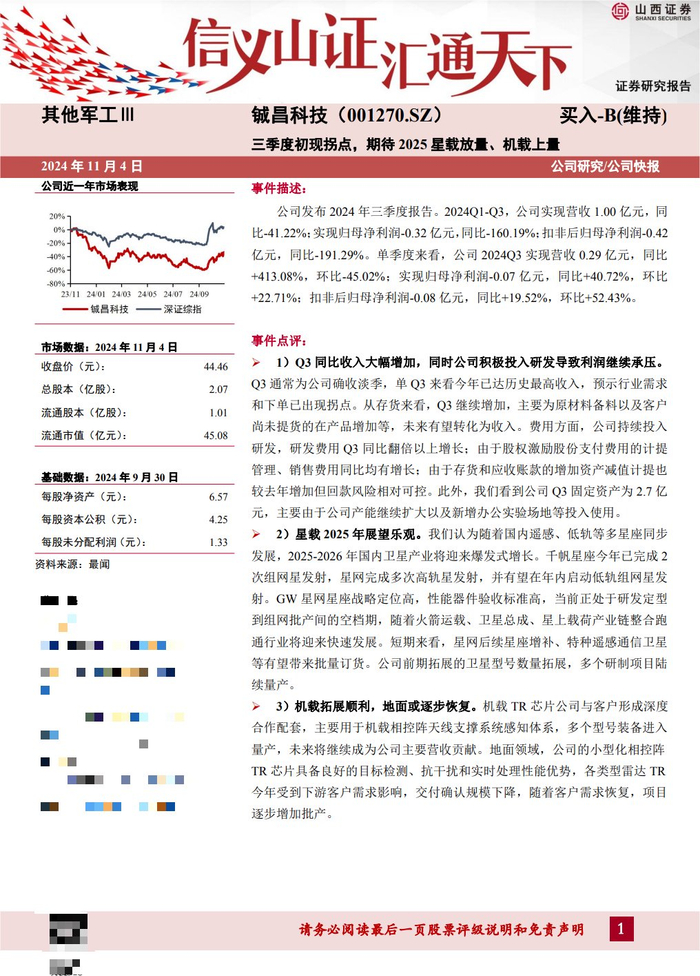 公司前期布局的多个项目中,机载领域配套产品自2023年的小批阶段陆续进入批产阶段,目前客户已陆续下达新的需求订单及合同,公司已进行备货并在交付中。机载领域作为公司发展的重点领域之一,已经成为了营收中的重要组成部分。地面领域产品受到下游客户需求影响较多,2024年交付规模较上年有所下降。公司地面领域近年来积累了很多项目和型号,随着客户需求计划的恢复,多个项目已在启动,逐步进入批产阶段。