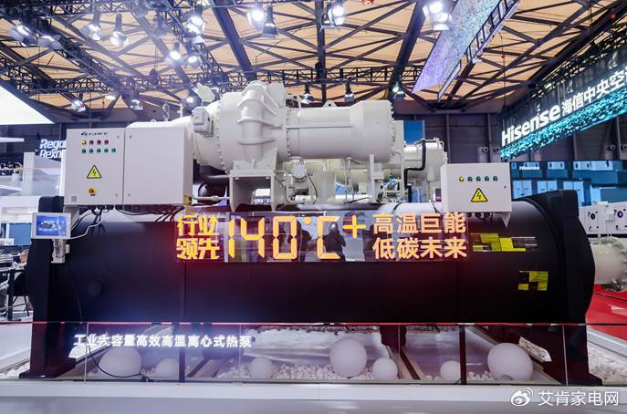 在中央空调展区,众多明星产品争先进入眼帘。其中,140℃+工业大容量高效高温离心式热泵机组前围满了人群,机组以高温、高效、低碳、大温升为核心优势,最高可制取140℃热水,能够充分满足非流程工业用热需求。同时,它通过搭载格力自研的永磁同步变频离心压缩机,电机效率达到98%,其创新性的直驱结构,能够让机械损失减少70%。