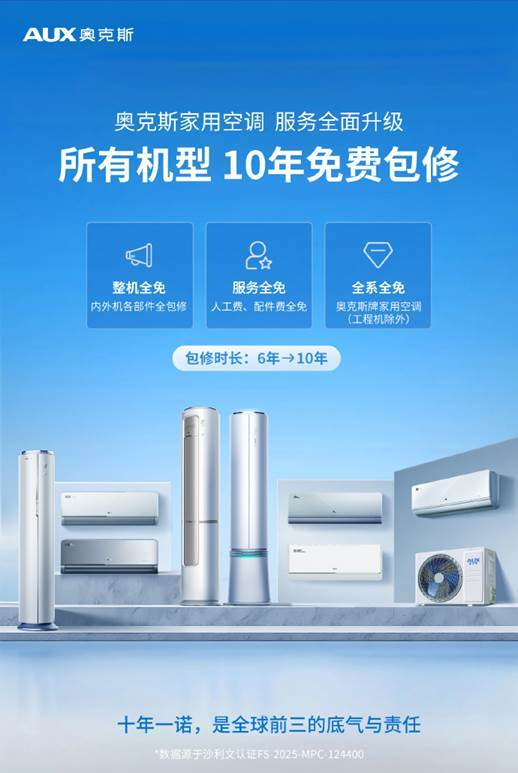 奥克斯空调以 “用户至上” 为核心,完成了服务承诺的阶梯式升级。2025 年 9 月,品牌率先对指定机型推出 “10 年整机免费包修” 政策,随后于 12 月加码升级,宣布自 2026 年 1 月 1 日起,在全国范围内将该服务覆盖至家用全系列空调产品。