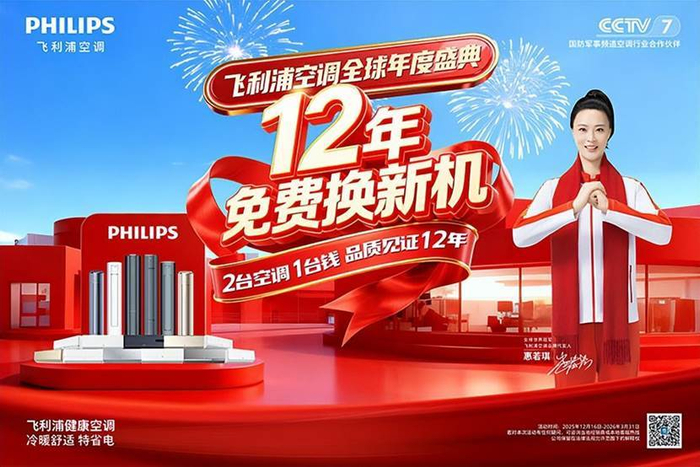 飞利浦空调推出 “12 年免费换新机” 活动。同时,家用空调享“六免服务”“价保全年,“极速送装”等权益,将服务流程从被动维修推向了主动、无忧的更高维度。