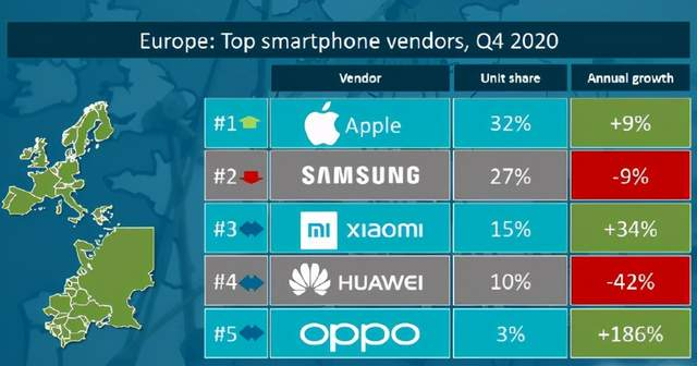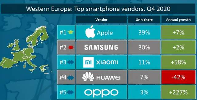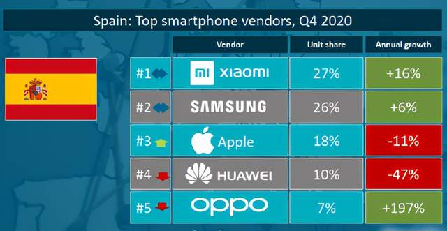近日,权威机构Canalys公布了2020年第四季度全球手机出货量情况,数据显示全球前五中有三家是中国品牌——小米、华为、OPPO。其中小米、OPPO在海外市场表现很猛,华为则因为外部因素份额下降较为严重。而小米在欧洲、西欧保持市场份额第三名的位置,在西班牙连续第四个季度取得市场份额第一的成绩。OPPO则开始释放全球渠道带来的红利,在不同地区都有着超猛的销量增长速度。
