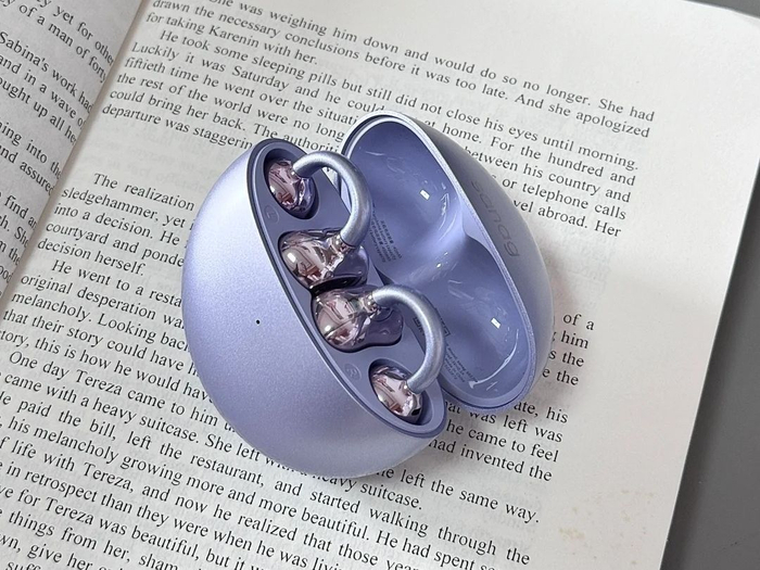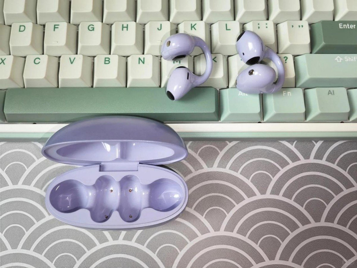 这款耳机戴着特别稳,佩戴感也不错,单耳仅 5.7 克重,戴久了也不会有酸痛感;采用人体工学结构,夹耳连接处是固定设计,没有弹力紧绷的困扰,戴起来很放松;连接梁用透明材质打造,通透美观,还能夹在耳骨边缘,保证基础的稳固贴合,走路、摇头都不会掉。