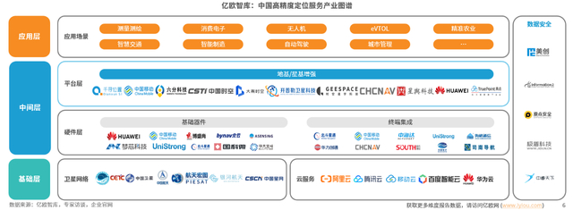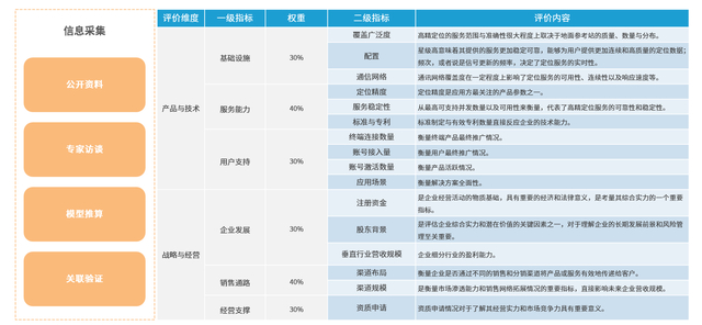 亿欧智库针对高精定位服务商建立的评价体系基于公开资料与专家访谈,从“产品与技术”“战略与经营”两大维度,下设 6 个一级指标、16 个二级指标展开评估。其中,“产品与技术”维度含基础设施(权重 30%)、服务能力(40%)、用户支持(30%),对应覆盖广度、定位精度等二级指标;“战略与经营”维度含企业发展(30%)、销售通路(40%)、经营支撑(30%),对应注册资本、营收规模等二级指标。