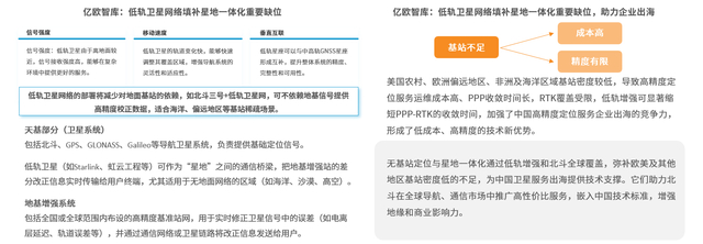 “星地一体化卫星定位”是一种将天基卫星系统与地面增强系统深度融合的高精度定位技术体系。其核心目标是实现全球范围内无缝、实时、厘米级甚至毫米级的定位服务,解决传统卫星定位在精度、覆盖范围和稳定性上的局限。低轨卫星网络能弥补地面基站覆盖不足,在无地面信号场景提供高精度服务;其作为天基与地基的通信桥接,适配无地面网络区域。同时,低轨增强可解决海外基站密度低导致的成本高、精度有限问题,缩短 PPP-RTK 收敛时间,助力中国高精定位服务出海,增强全球市场竞争力与影响力。