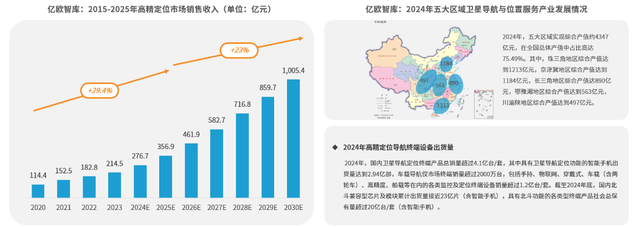 2020 年北斗组网成功为市场提供显著推力。2023 年市场销售收入 214.5 亿元,预计 2025 年达 357 亿元、2030 年超 1005 亿元,未来,市场由爆发式增长转向稳步增长。2024 年五大区域产业综合产值约 4347 亿元,占全国总值 75.49%,带动全国高精定位市场销售收入的持续增长;同年终端设备总销量超 4.1 亿台/套,智能手机等终端销量超 1.2 亿台/套,北斗兼容型产品保有量超 20 亿台/套,体现终端规模的快速扩张。