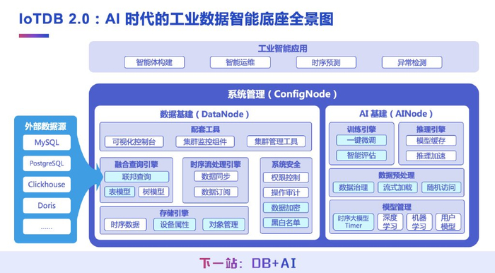 “AI时代数据管理出现很多新需求,为此Apache IoTDB一直在持续进化,”乔嘉林介绍,“此次推出的IoTDB 2.0版本,以专业时序数据库、数据联邦查询组件、智能分析组件为核心,创新打造了新一代工业级数据智能底座,可满足工业监控、设备运维、复杂数据治理、定制场景预测、异常预测等多类产业需求。”