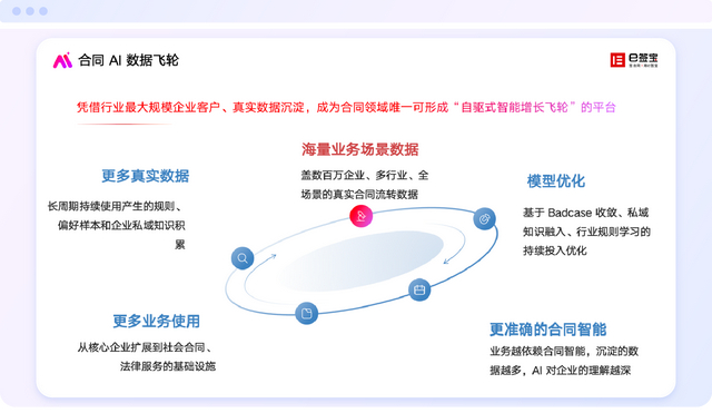 电子签名是合同链路中最刚性的环节,e签宝凭借这一入口触达了百万级企业用户,处理百亿级合同,成为合同数字化的基础设施。这一地位使其能自然沉淀合同的结构化信息、条款、流程节点、审批行为等全链路数据资产,为AI训练提供了其他产品无法获取的全链路数据基础。