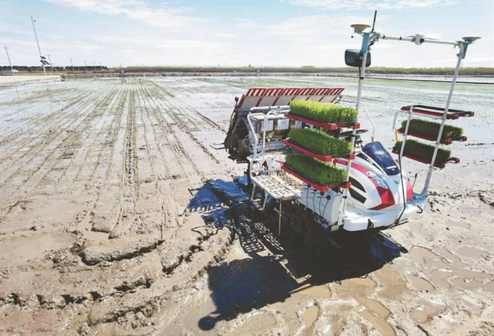 12.东北一农场使用5G无人插秧机耕种。