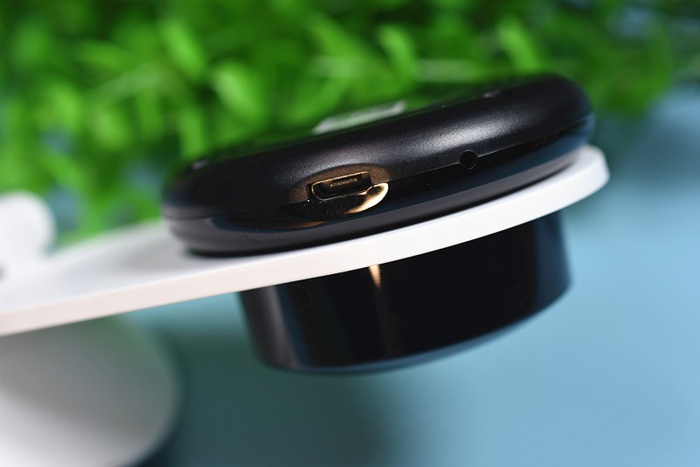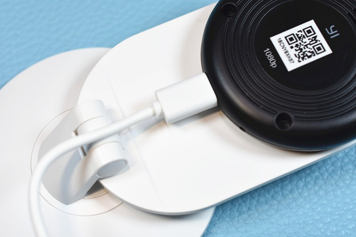 小蚁1080P版智能摄像机没有内置电池,需要外接Micro USB线,Micro USB接口正好位于摄像头底部,除了可以使用原装电源适配器充电外,遇到家里断电,还可以使用移动电源进行临时供电。此外,在Micro USB接口一侧还有一个Mic孔,通过Mic和扬声器的组合,可以实现双向语音通话。
