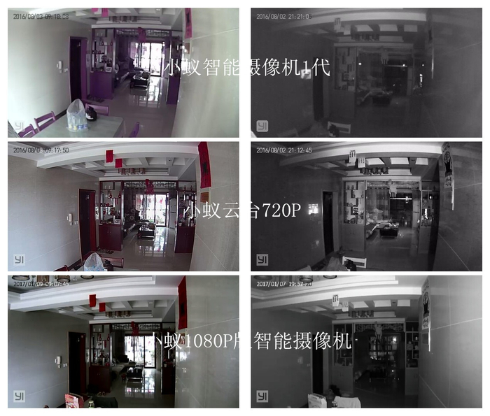 笔者有幸参与过小蚁智能摄像机1代、小蚁云台720P的测评,所以可以直观的用画面的情形来和小蚁1080P版智能摄像机进行对比。三台机器测试的都是同一地点,小蚁智能摄像机1代和小蚁云台720P是在同一光线环境下录制的画面,小蚁1080P版智能摄像机的画面录制环境有差异,正好近期基本没见太阳,所以白天的光线不是很好。