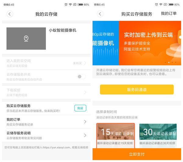 小蚁1080P版智能摄像机支持SD卡/小米路由器硬盘版/云存储三种存储方式,SD卡存储是必选的,而小米路由器硬盘版存储和云存储是非必选的,用户可以根据实际使用情况进行选择。云存储,是小蚁提供的一项付费服务,用户可以自主选择15天滚动云录制还是30天滚动云录制。