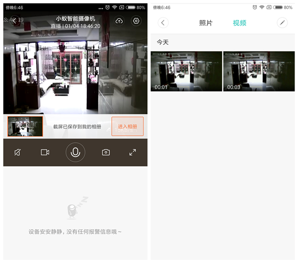 除了回看历史画面,用户还能通过APP对实时画面进行截图和录像,所有录制的图片和画面均保存在相册内。