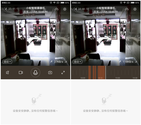 进入APP主界面后,用户可以直接观看到小蚁1080P版智能摄像机的实时画面,如果想进行画面回看,用户可以随意点击视频画面的任何位置,就能调出历史查看界面。由于笔者开启了移动监测,并非全时段监测,所以只有移动到黄色部位时才能进行画面回看。