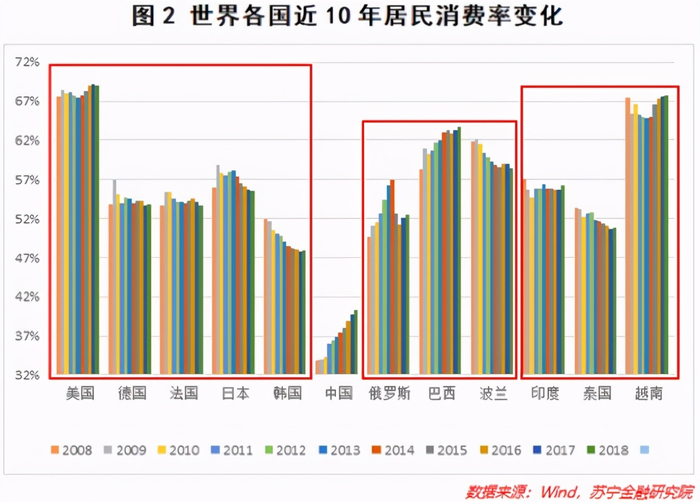 中国新消费的黄金十年,才刚刚开始。据苏宁金融研究院,作为衡量消费的一个重要指标,中国2020年居民消费率(即居民消费/GDP)比一般发达国家要低20个百分点左右,仍有很大空间。