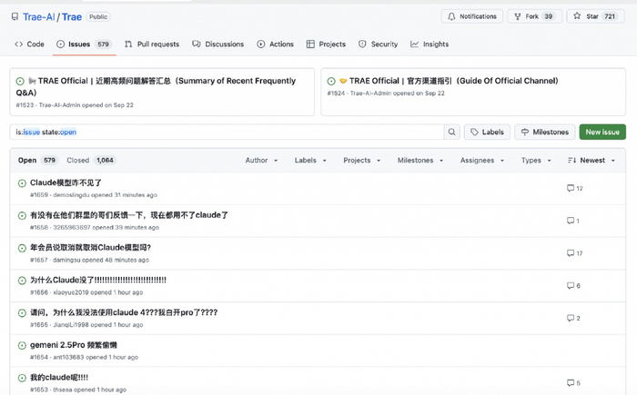 近期,大模型之家注意到,在GitHub社区上,关于Trae“背刺”的声讨此起彼伏:大量购买了Trae年费(Pro版)的用户发现,他们花真金白银买下的Pro权限,却突然发现Trae悄然下架了Claude大模型的使用权限,而这一举动,引发了开发者冲进了GitHub上的Issue区,纷纷表达自己的不满。