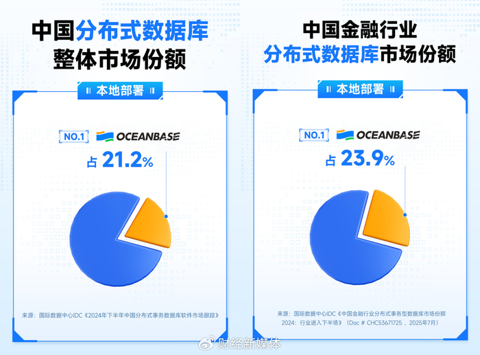 近日,IDC发布的《中国金融行业分布式事务型数据库市场份额,2024:行业进入下半场》报告显示,2024年中国金融行业分布式事务型数据库市场规模达20.37亿元,金融行业本地部署子市场规模高达14.72亿元。其中,OceanBase海扬数据库以23.9%的份额脱颖而出;IDC同期发布的《2024年下半年中国分布式事务数据库软件市场跟踪》报告显示,2024下半年,OceanBase在本地部署整体市场更是首次以21.2%的份额登顶。这一结果不仅证实了中国的技术实力,更是标志着国产数据库完成了从实验室突破到商业验证的关键跃迁。