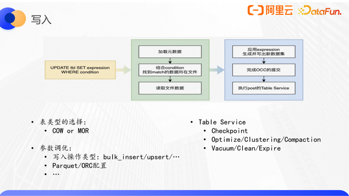 优化写操作,选择适合当前场景的表类型(如MOR表),并配置合适的参数。在湖格式场景下,这种后置的追加在湖格式写入后面的table service其实是逐渐成为了影响效率或者整体作业稳定性的关键性因素。要解决这样的问题,比较通用的做法就是拆成两个链路:一个链路就是正常写入,另外一个链路是用离线的方式通过调度一个作业来执行table service任务,包括像clean、Hudi表管理等等。