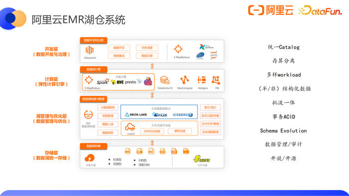 相较于传统的数仓、数据湖来讲,湖仓系统是一种新的数据管理系统。上图展示了阿里云EMR湖仓系统的整体架构,它是围绕着Delta Lake、Iceberg、Hudi等开源数据湖格式构建的,它同时具备数仓的高性能和数据湖的低成本、开放性。这些数据湖格式基于开源的Parquet和ORC构建,能够在AWS S3、阿里OSS等低成本存储系统上运行,它还具备ACID事务、批流一体以及Upsert等能力,可以对接多种商业或开源的查询计算引擎。这些能力使得湖仓体系逐步成为了一种趋势。
