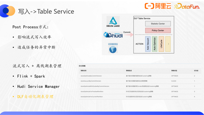 在阿里云EMR场景下,有些同时使用Flink和Spark引擎的客户,会采用Flink Hudi入湖和Spark离线管理的方案。另外EMR也提供了中心化的自动化湖表管理,是结合阿里云的DLF服务实现的。如图所示,湖格式自动将commit信息同步到DLF湖表服务,该服务将根据预定义的策略和实际表的状态及配置判断是否要产生湖表管理类的操作。