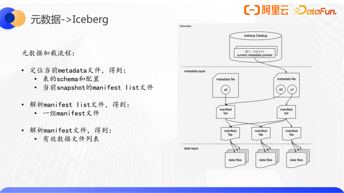 定位到当前metadata文件,得到表的schema和配置,和当前数据文件快照snapshot的manifest list文件