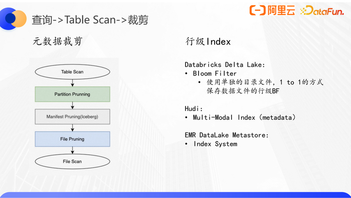 在得到表的全部有效数据文件后,我们还是要根据查询条件来尽可能的进行裁剪,以减少最终读取Parquet或者ORC文件的体量。Table scan优化分为两类:一是元数据裁剪,二是行级索引。元数据裁剪又可以分为分区裁剪、Manifest裁剪(Iceberg特有)、File裁剪等不同粒度。