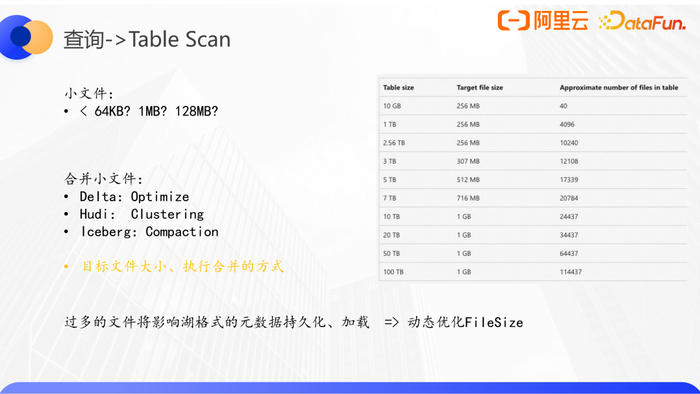这里小文件对查询的影响是大家所熟悉的。三个湖格式都提供了相应的合并小文件的功能,关键问题其一是目标文件设置多大是合适的,其二合并操作执行的时机和方式,这点我们后续再展开。默认情况下parquet在各引擎都是128M左右,但这是否是最优的还要看表的整体规模。过多的文件,将会导致元数据规模变大,影响元数据的读写,databricks和阿里云emr都提供了自动调教file size的功能。这里给出databricks的设置文件大小和表规模的映射关系。为了控制元数据的规模,对于10TB的表建议文件大小设置为1G。