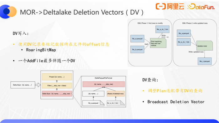 Delta Lake通过Deletion Vector的设计解决写放大的问题。Delta Lake将需要更新、删除的数据在原数据文件中的offset标识出来,写入一个辅助文件。Iceberg V2表有两个MOR的实现,其中基于position的设计和Delta Lake的DV是基本一样,仅在具体实现上有些区别。DV的写入仅两步:1)根据update或者delete的condition,找到文件中匹配的记录,记录他们在文件中的offset。持久化到一个bin文件中;2)将更新后的数据,写到普通的一个新文件中。