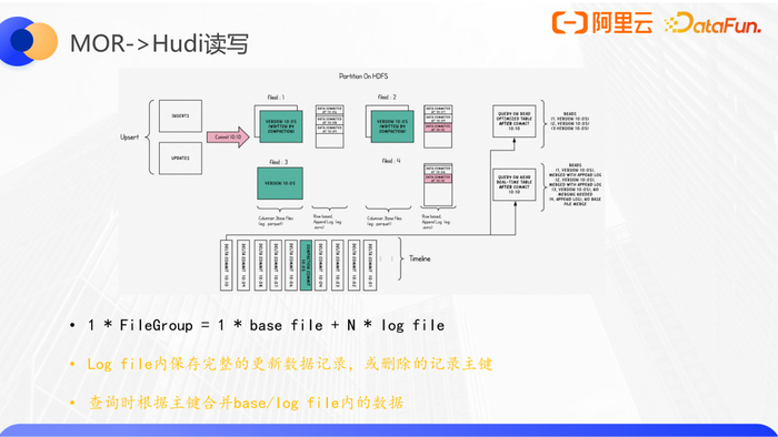 Hudi定义了一个filegroup概念,每个group包括最多1个原始数据文件和多个日志文件,数据文件运行不存在。