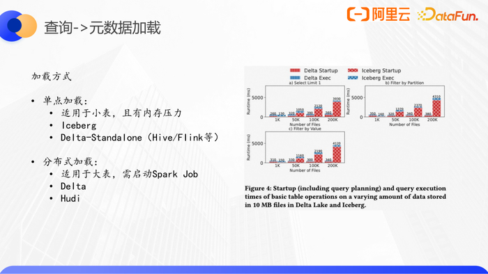 元数据加载包括获取schema、构造fileindex等,分为单点加载和分布式加载两种。单点加载的代表有Iceberg、Delta Lake-Standalone,适用于小表,有内存压力。分布式加载的实现有Hudi、Delta Lake,适用于大表,需提交Spark Job。