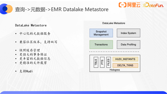 EMR DataLake Metastore目前已经支持了Hudi格式,完全兼容社区版本和元数据协议,同时支持元数据双写。在提供了文件快照和事务的同时,后续也将继续拓展data profiling和行级索引为查询提供更精准的裁剪优化。