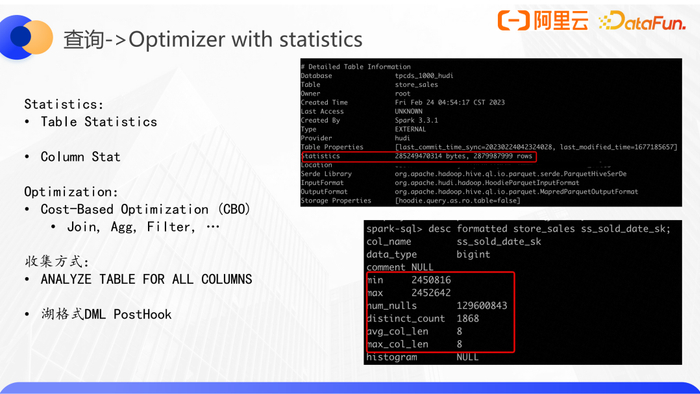 如何打通湖格式自身和Spark需要的statistics。spark会从table properties获取统计信息,而一般情况湖格式的统计信息都是记录到自己的元数据中,这部分需要更好的打通和复用。