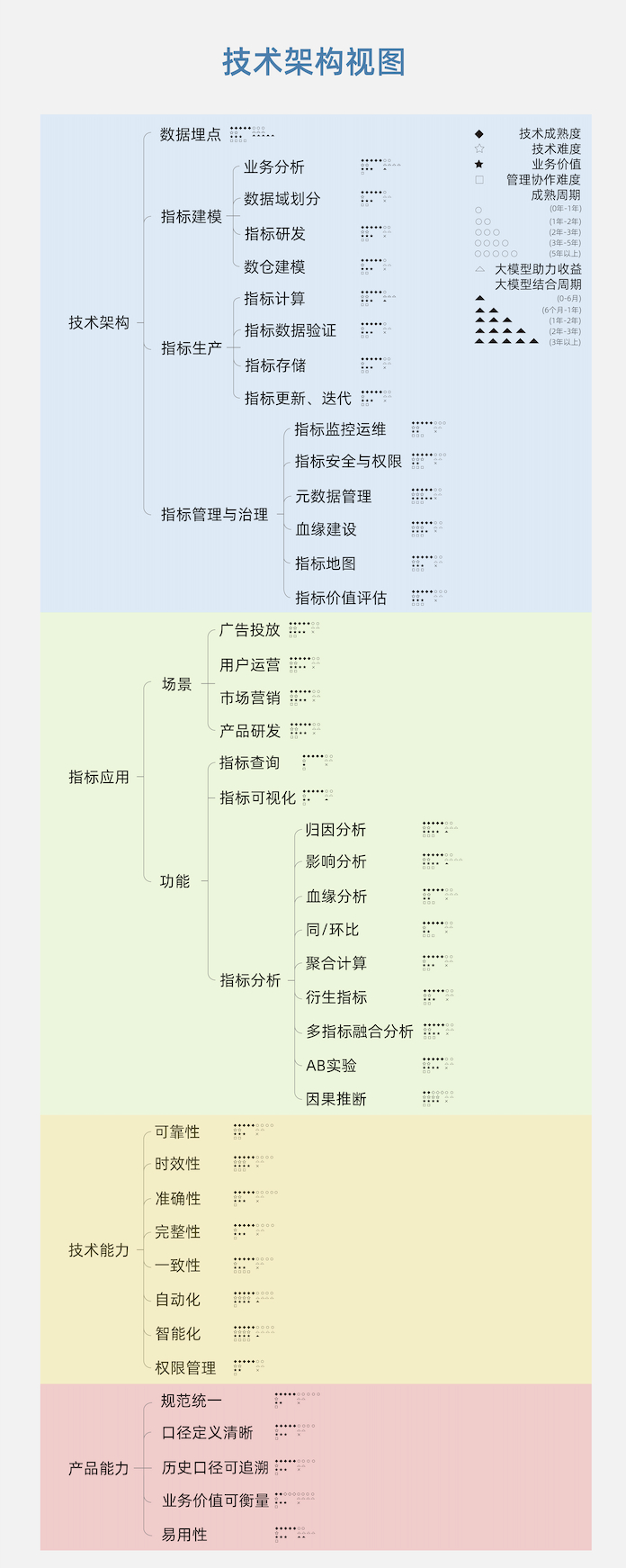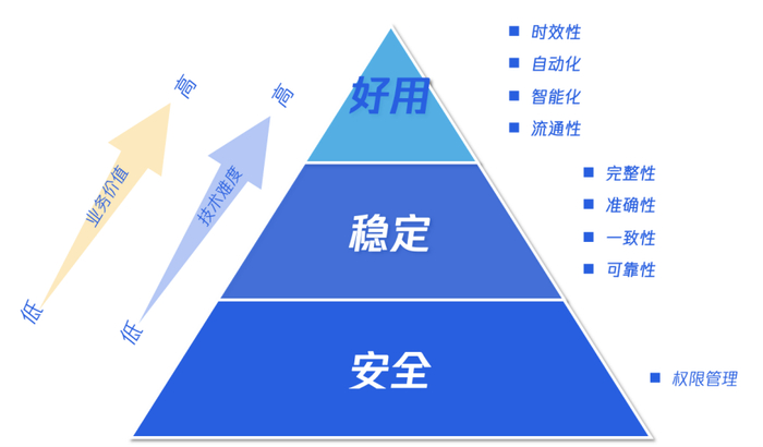 一个成熟的指标体系,需要在技术上满足“安全”、“稳定”和“好用”三个层次的诉求。这三个层次的诉求对应的技术难度和业务价值都是由低到高的。
