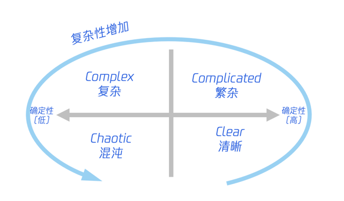 业务中的场景很容易分成两种状态,一种是清晰的(Clear),另一种事混乱的。(Chaotic)。清晰的场景有明确的步骤,结果是确定的,比如流水线。而混乱的场景随机性和未知性都太高了。肯尼芬框架在清晰和混沌之间增加了两个维度,繁杂(Complicated)和复杂(Complex)。