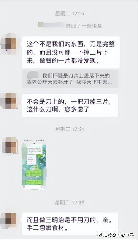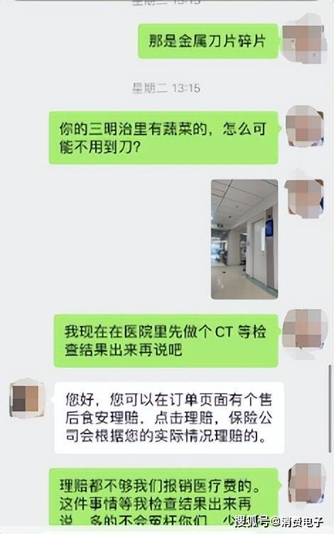 在与平台沟通的同时,麦女士也向涉事商家反馈了情况,并告知商家相关医疗情况。但商家方面当即否认刀片来自其店内,回复称:“这个不是我们的东西,刀是完整,而且没可能一下掉三片下来,做餐的一片都没发现”,“而且做三明治是不用刀的”。商家让麦女士通过平台提供的渠道申请赔偿,称“保险公司会根据您的情况理赔的”。