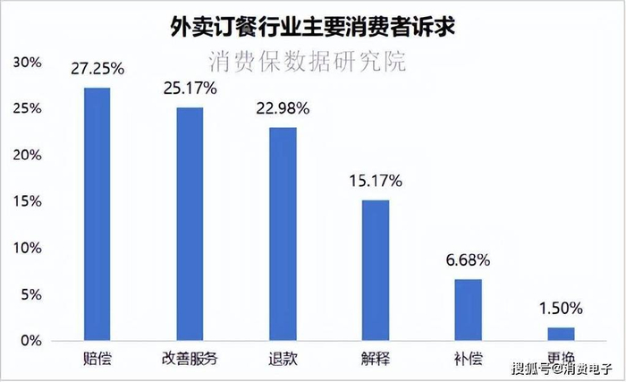 外卖订餐行业消费者诉求中,赔偿诉求占比 27.25% ,居首位。在遭遇食品安全问题、商品损坏等情况时,消费者期望得到合理经济补偿;改善服务占比 25.17%,表明消费者对整个外卖流程,从商家服务到配送服务提升的迫切需求;退款诉求占比 22.98%,解释、补偿、更换的投诉占比也较大。