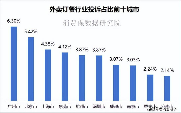 从地域分布数据来看,广州市以 6.30% 的占比成为投诉用户最多的城市,北京(5.42%)、上海(4.38%)紧随其后,东莞、杭州、深圳、成都等城市也有一定占比。