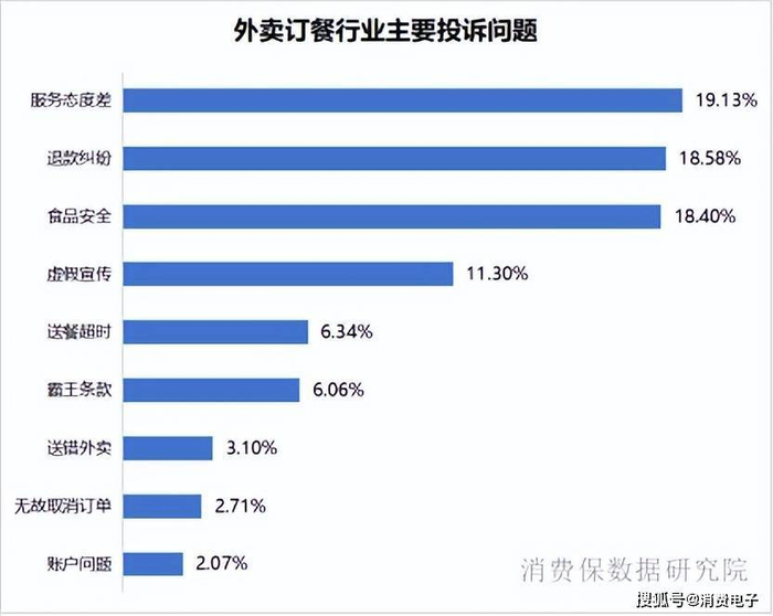 外卖订餐行业的主要投诉集中在服务态度差、退款纠纷和食品安全等方面。数据显示,这三者几乎并驾齐驱:服务态度差以19.13%的占比居于榜首,退款纠纷(18.58%)与食品安全(18.40%)紧随其后。