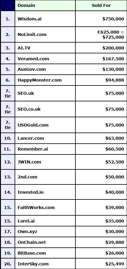 最显眼的是与人工智能叙事天然同频的后缀组合。一枚语义清晰、直指“智慧”的单词域名Wisdom.ai以约人民币547.5万元拔得头筹;紧随其后,一个充满“无限可能”意味的通用主后缀域名NoLimit.com以约529.25万元成交。另一枚与视频和直播场景高度契合的后缀AI.TV则写下公开成交的新高,约146万元的价格,背后是“内容×AI×分发”的三重共振。与此同时,医疗与公共服务语义的两个通用主后缀域名Veramed.com和AusGov.com分别以约122.28万元与约94.9万元落槌,印证了“可全球化传播的好词+稳健业务场景”的长期价值。仅前五名,合计已近人民币1,440万元。