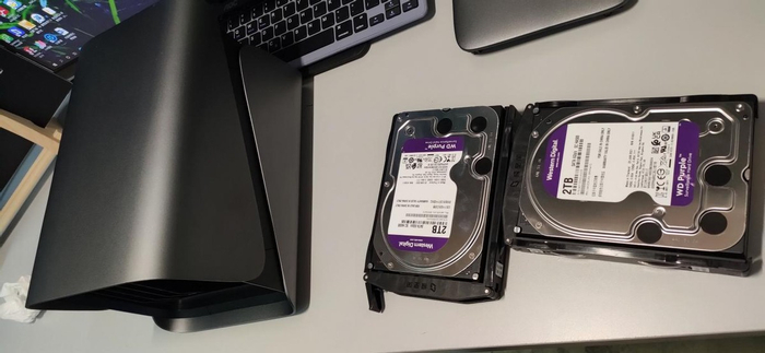 打开包装,第一感觉就是十足的科技感,主机主体是深灰色的,整体外观采用了中心对称的设计,极具观赏性。同时还有2个2T的硬盘,合计4T,相当于8个电脑内存了。