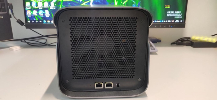 散热网下是两个网口和电源线插口,通电插上网线,这就齐活可以使用了。