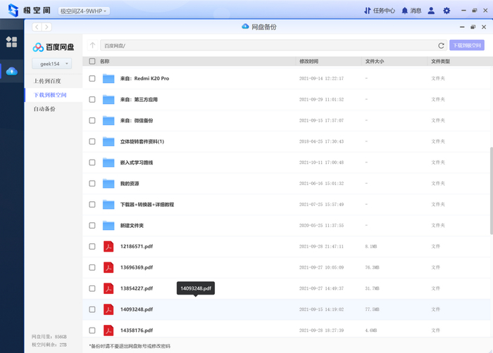 极空间私有云Z4打通了迅雷百度网盘的接口,可以和这两个软件互传文件,这一点可以说是非常方便。当别人通过各种链接把工作文件分享给我时,我可以先保存到百度网盘,然后转存到极空间私有云Z4的客户端。同时很重要的一点是,一定要按顺序按规律重命名,这样便于后期的查找资料。形成这个好习惯,一定会受益的。
