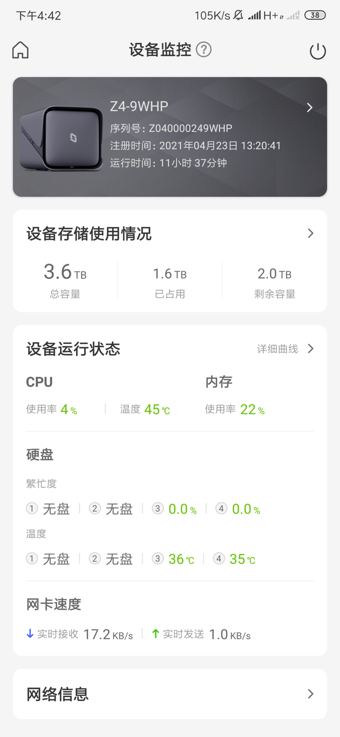 人累了会说话,机器运行也会有温度、内存的运行状态,但是机器不会说话,那么我们如何知道机器的运行状况呢?极空间私有云Z4的客户端就可以查看机器的运行时间、内存、温度、CPU占用、传输速度等详细对的运行数据。让我们做到心中有数,可以随时随地了解信息,出现问题时,可以发现原因,对症下药。