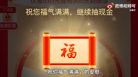 是的,一句“祝您福气满满,继续抽现金”的祝福。而这位视频主在耗完500+好友助力后,依然没有得到最终的现金奖励。