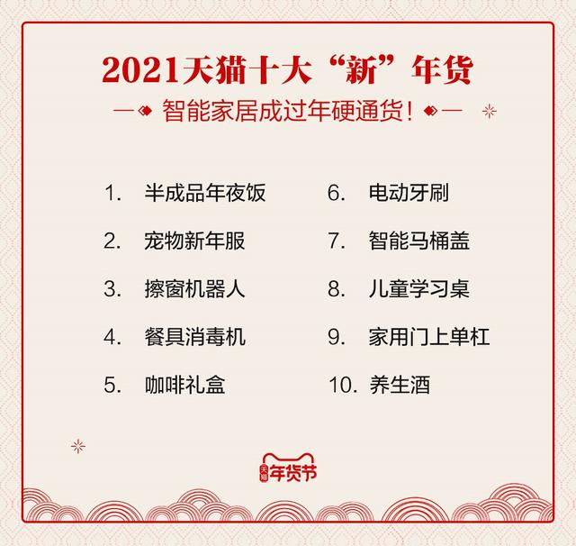 而随着年轻人接棒“年货采办权”,过年清单里也多了不少新物种:半成品年夜饭、宠物新年服、擦窗机器人、冻干粉咖啡礼盒、家用门上单杠、智能马桶盖、养生酒等上榜2021天猫增速最为显著的十大“新”年货。