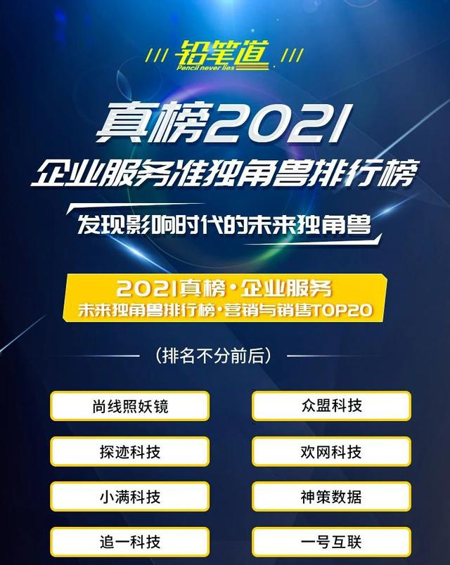 经过审慎而激烈的评估角逐,众盟科技与1800家公司同平台竞争,经过40多个调研维度的重重考验脱颖而出,凭借强大的私域直播营销服务实力荣登企业服务未来独角兽排行榜·营销与销售TOP20。