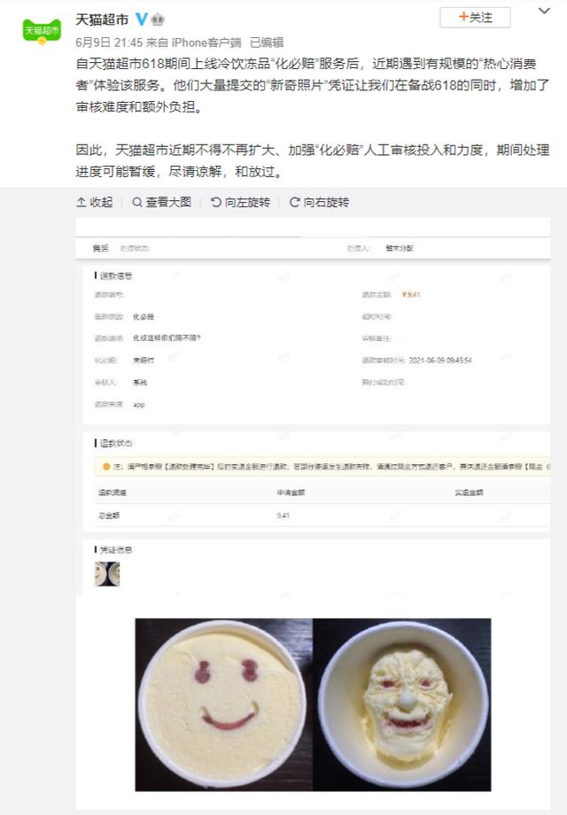 6月10日消息 天猫超市昨夜通过官方微博暗示,其618推出的冷饮冻品“化必赔”服务遭遇有规模的恶搞索赔,并且透露在加大人工审核期间,该服务处理进度可能暂缓。