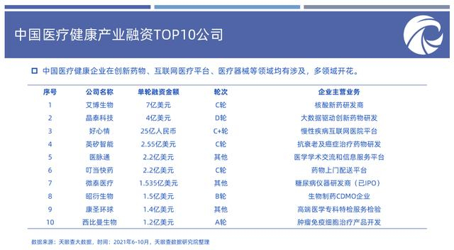 截至2021年9月,中国共有52家医疗健康企业登上“全球独角兽企业500强”榜,数量位居全球第二。医疗健康企业具备较强吸金能力,2021年6月-10月,融资TOP10公司单轮融资金额就高达48.585亿美元。中国医疗健康企业总估值达2176.82亿美元,较2020年上涨661.67亿美元。互联网大厂对医疗健康赛道也有超高热情,投资构建了相对完整的医疗健康版图,并互有差异化。